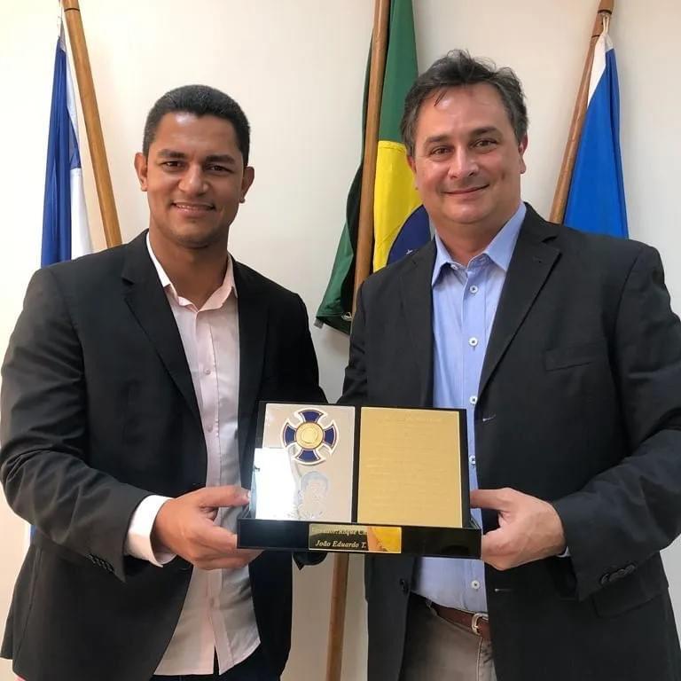 O médico cardiologista Joao Eduardo Tinoco de Paula recebe homenagem das mãos do presidente do legislativo linharense, vereador Roque Chile.
